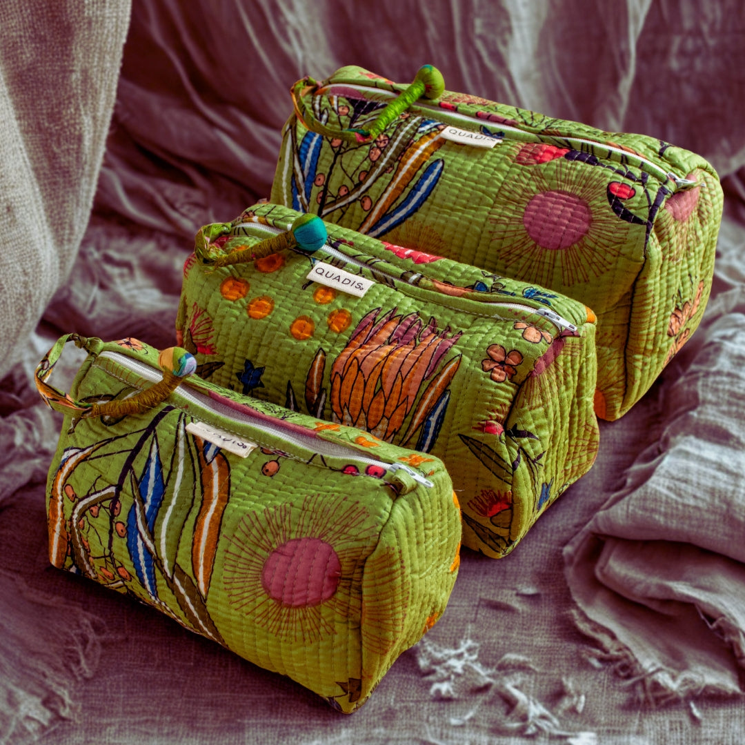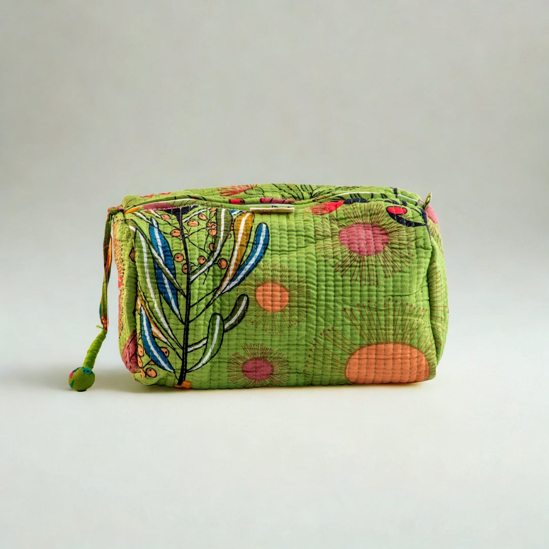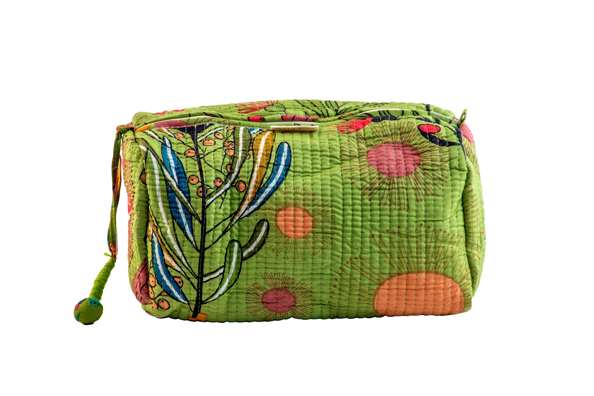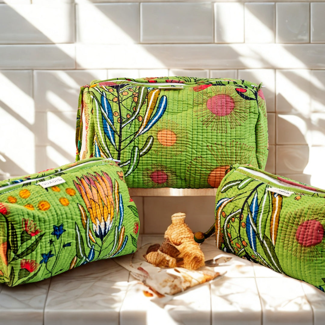 Bursting with botanical whimsy and bold imagination, the Botanika wash bag is a vibrant ode to wild meadows and untamed greenery. With a lively palette of leaf greens, coral suns, and pops of pink and blue, this hand block printed design captures nature’s playful spirit—reimagined through the eyes of a dreamer.