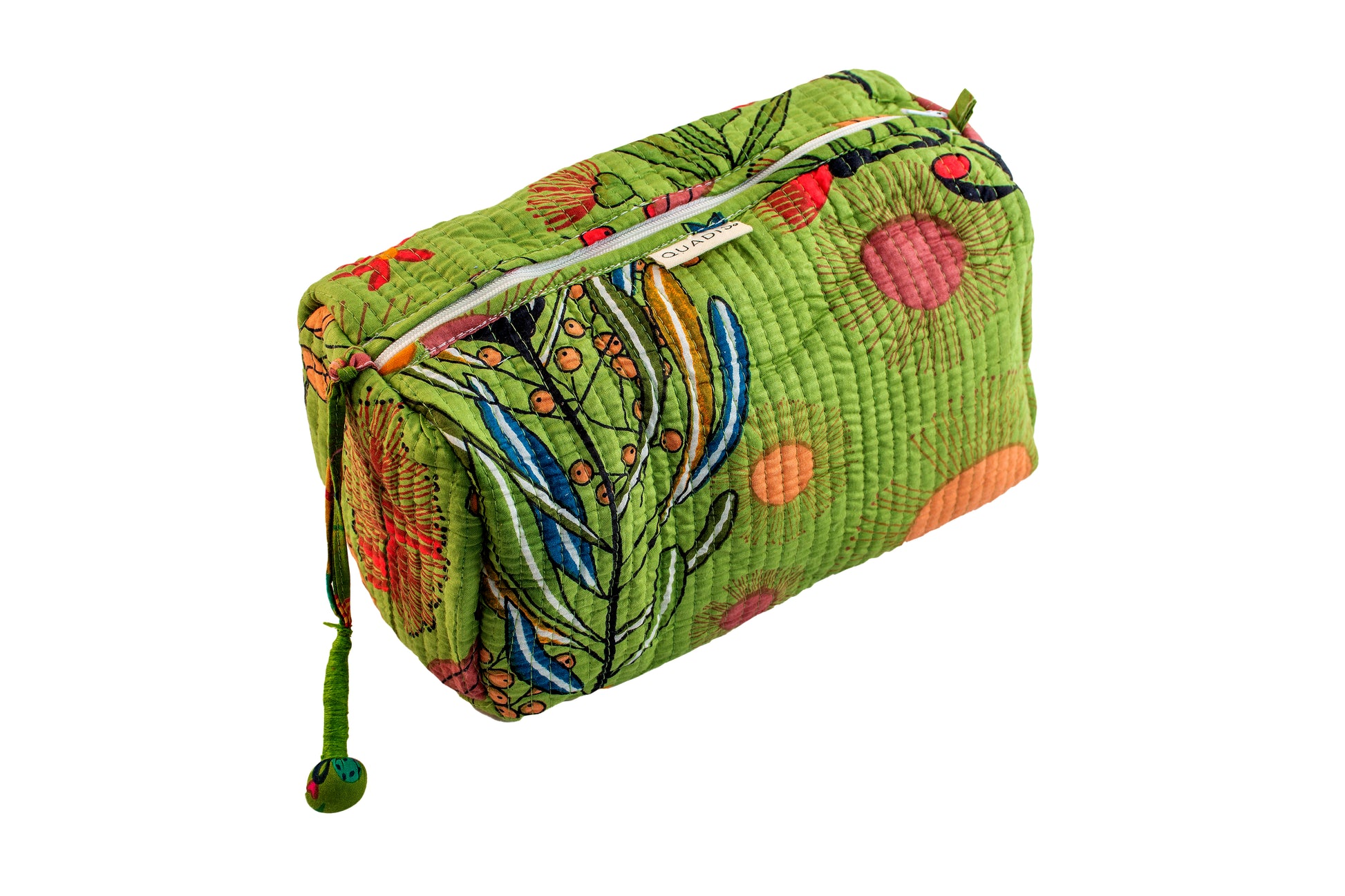 Handmade from soft quilted cotton and finished with a water-resistant lining, this joyful piece is not only eye-catching but incredibly functional. It features three inner pockets, a sturdy top handle, and a fabric zip pull adorned with a cheerful pom—designed for the wanderer who finds beauty in the unexpected.