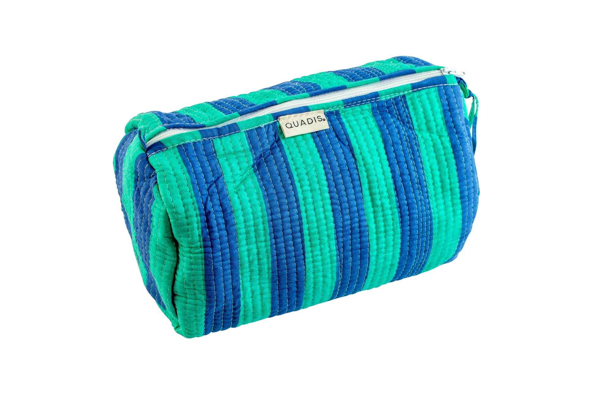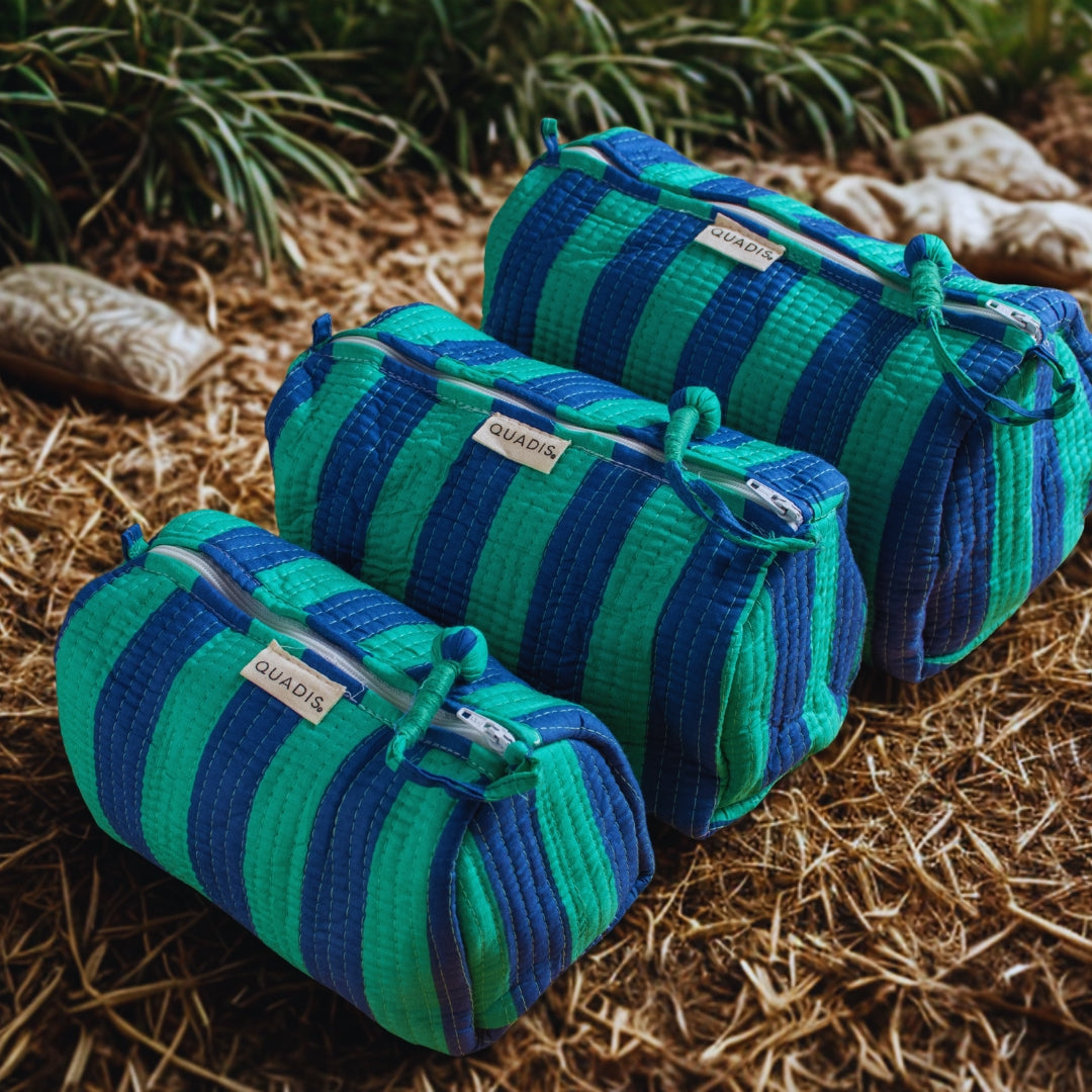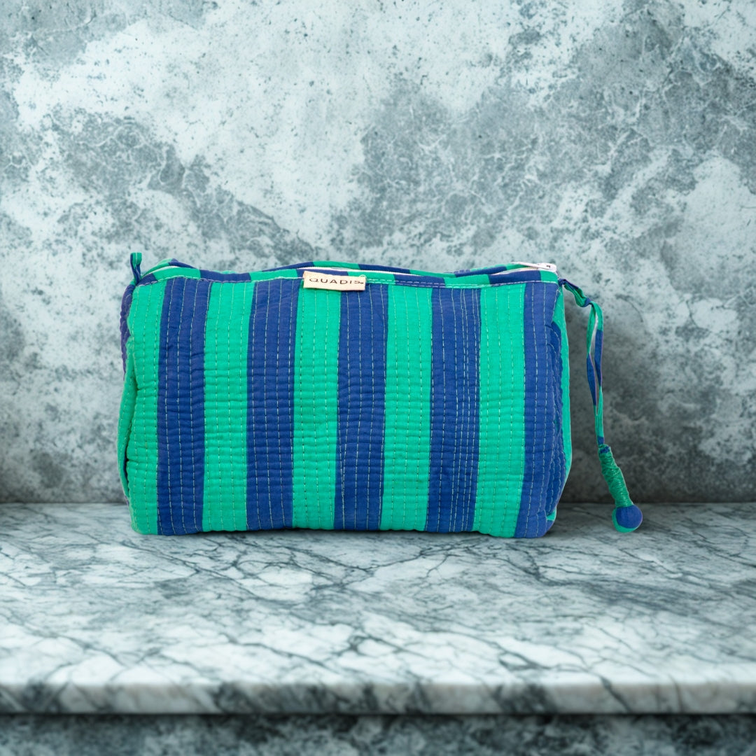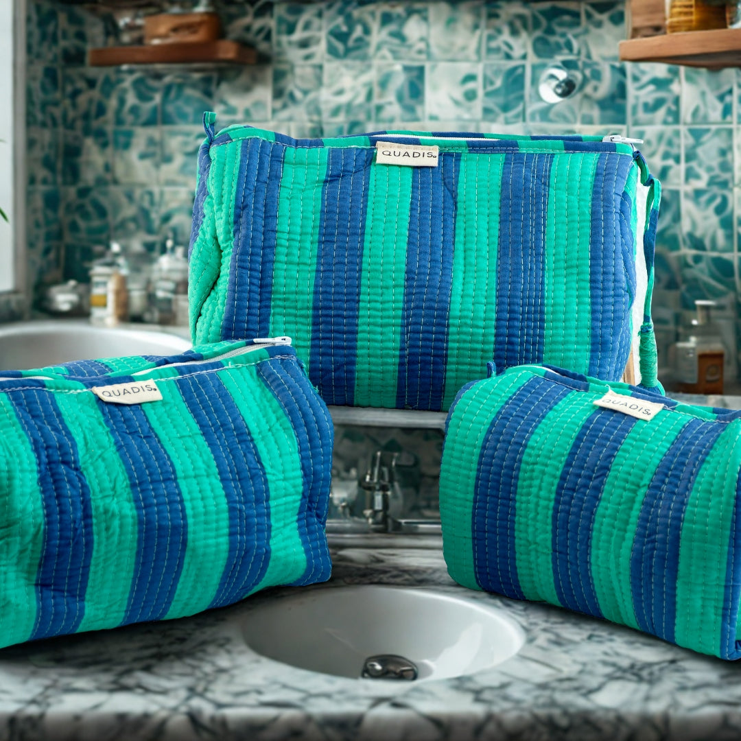 Like a fresh sea breeze on a sun-drenched shoreline, the Coastal Lines wash bag captures the rhythm of ocean waves and summer escapes. Hand block printed in Jaipur, this bold design features striking stripes of seafoam green and deep ocean blue—a nod to coastal living in its most spirited form.