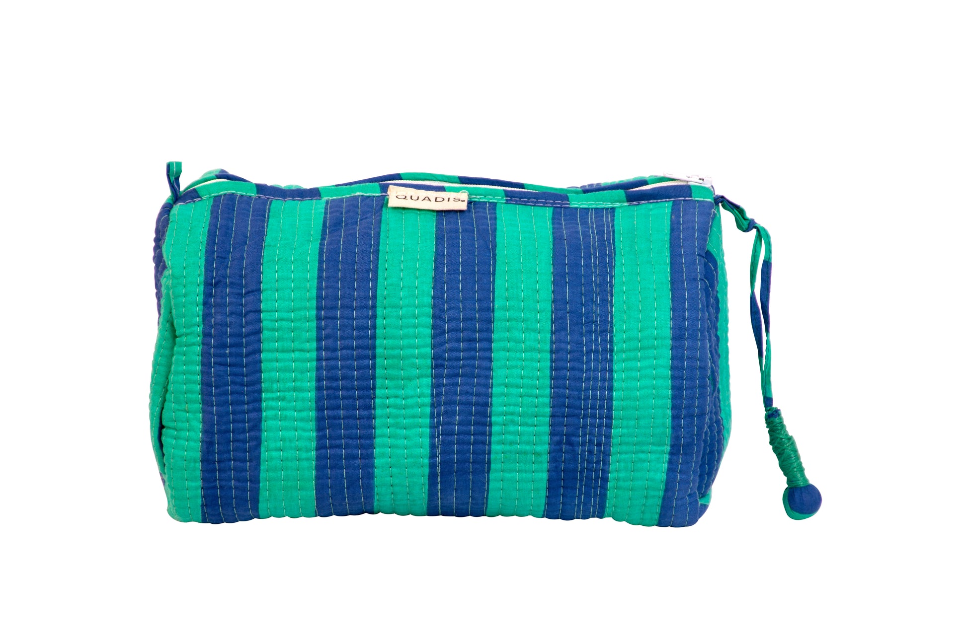 Made from quilted cotton with a water-resistant lining, this piece is as practical as it is playful. With three interior compartments, a top handle for easy carrying, and a handcrafted pom zip pull, it’s your ideal travel companion—whether you’re sailing off for the weekend or just dreaming of it.