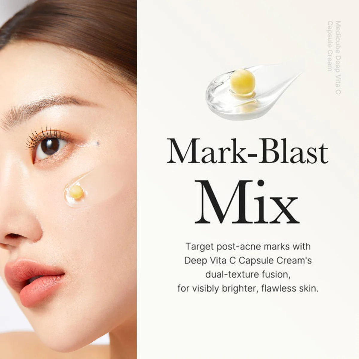 Introducing the Deep Vita C Capsule Cream, a revolutionary skincare solution designed to care for uneven skin tone and spots, leaving your skin bright, radiant, and even-toned. This customizable cream features a unique dual-texture formula, combining a Vitamin Capsule cream with a transparent gel.