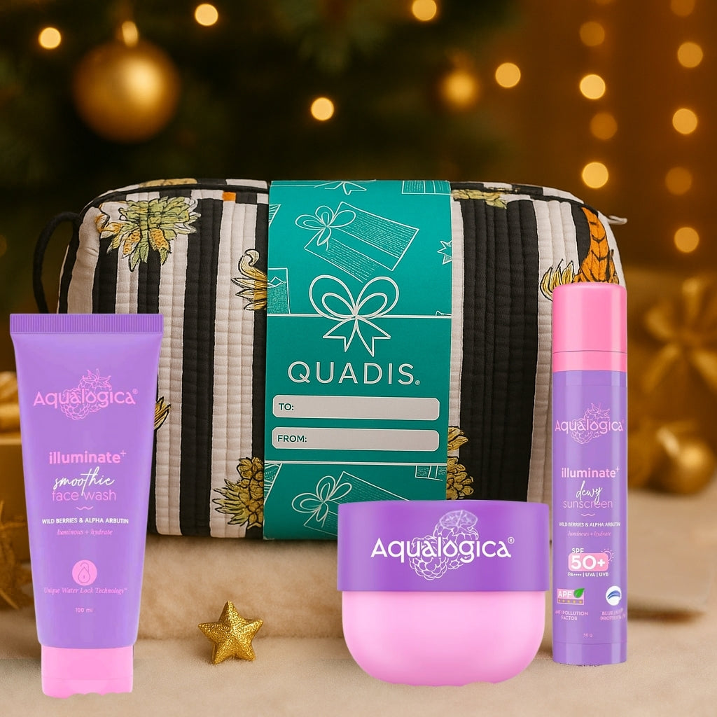 This festive trio brings together Aqualogicaโs Illuminate+ Smoothie Face Wash, Illuminate+ Hydra-Gel Moisturizer and Illuminate+ Dewy Sunscreen SPF 50+ โ all enriched with Wild Berries & Alpha Arbutin for instant radiance and long-lasting hydration.