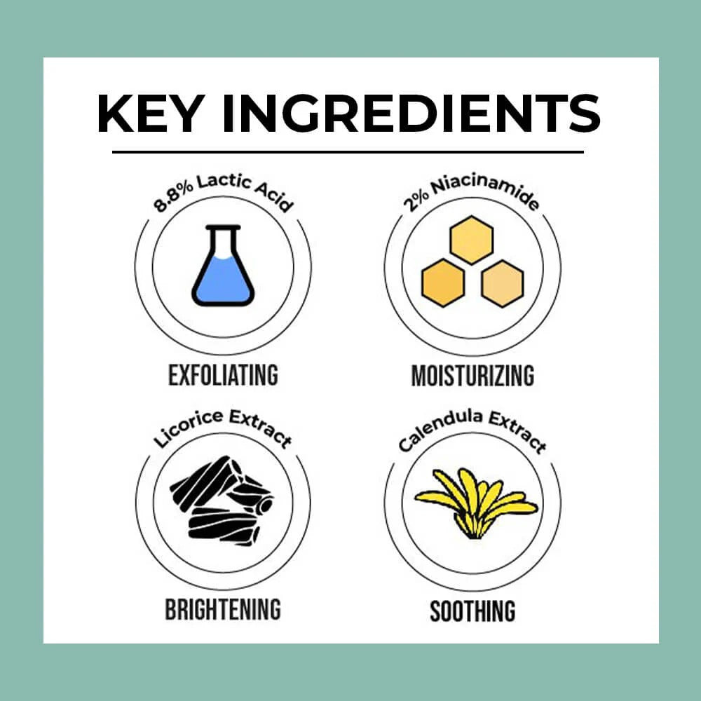- 8.8% Lactic Acid: Exfoliates by dissolving dead skin cells and surface debris for a bright, fresh-looking complexion.