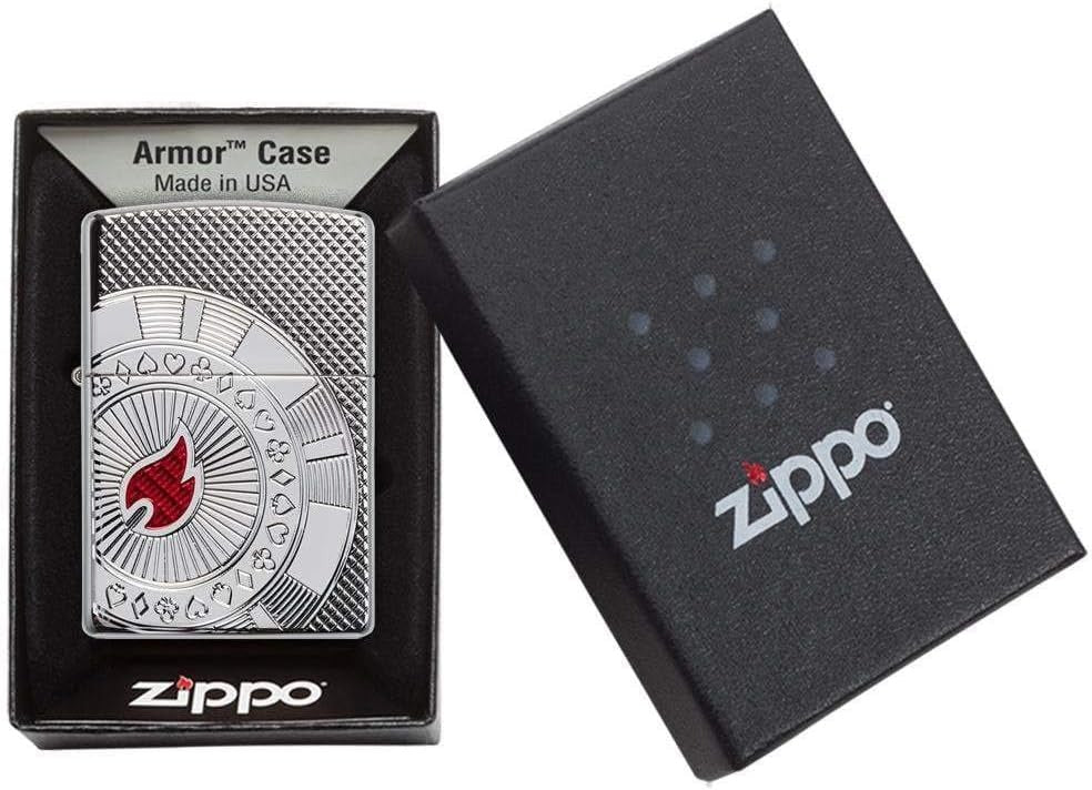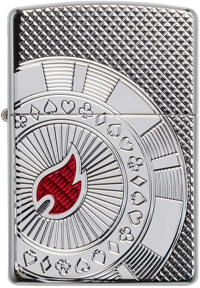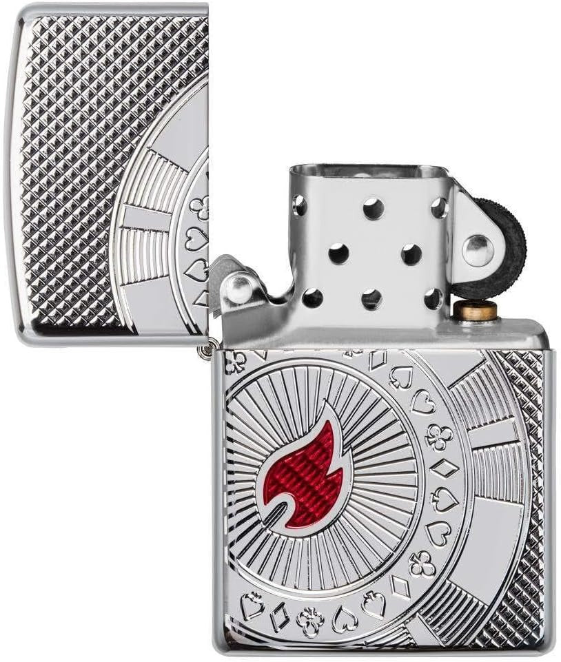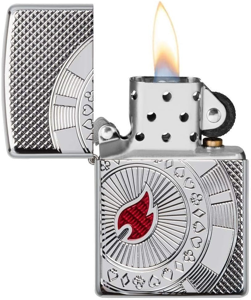 Put some luck in your pocket with one of these lighters from our card collection. This collection is created using four of Zippo's various imprint methods; color image, emblem attachments, laser engraving, and auto two tone. These unique designs have been placed on three different lighter cases; Brushed Chrome, Black Ice, and Satin Chrome. Each lighter has a bottom stamp signifying the year it was made, is refillable, and is backed by Zippo's famous lifetime guarantee. All windproof lighters are American made in our Bradford, PA factory and come packaged in a gift box.