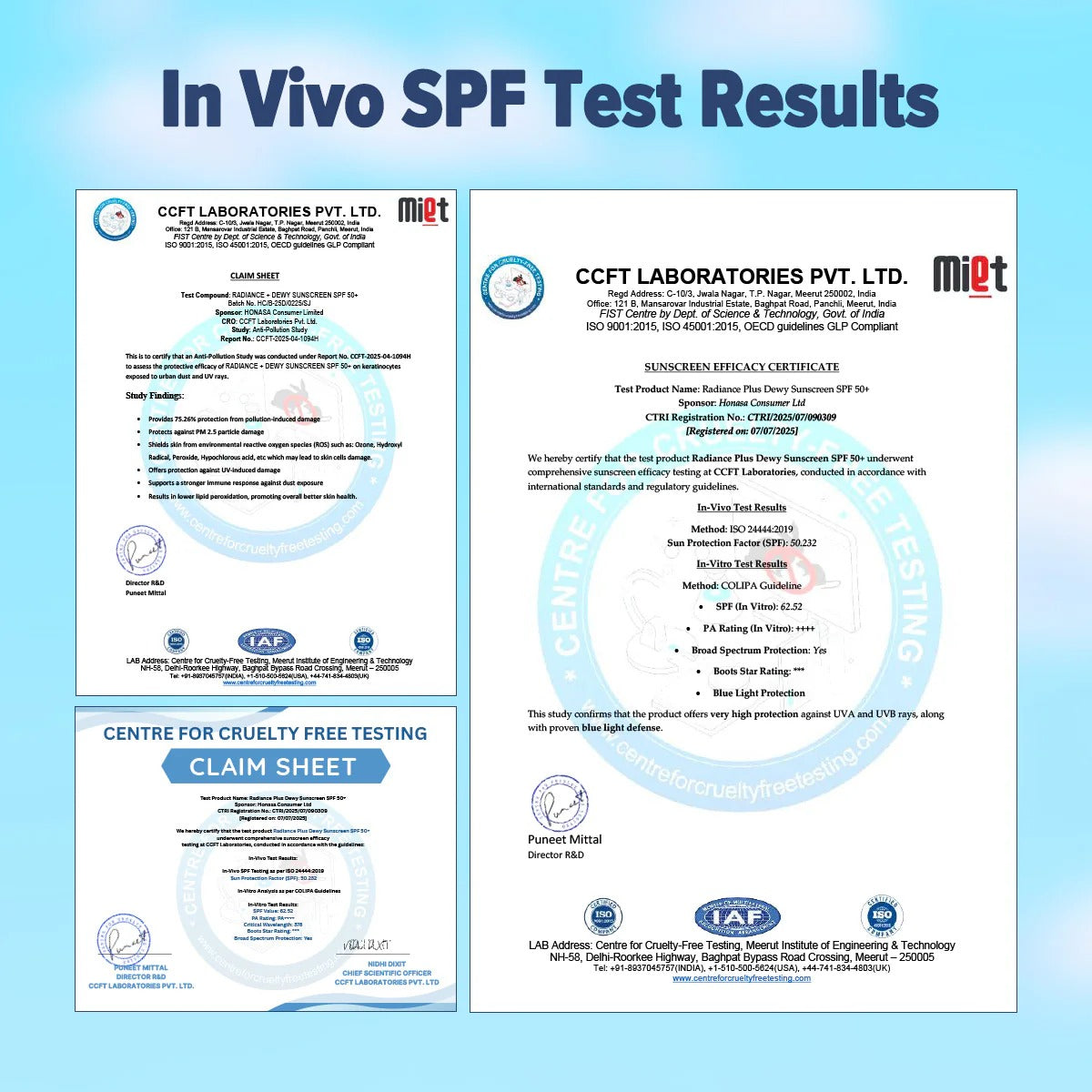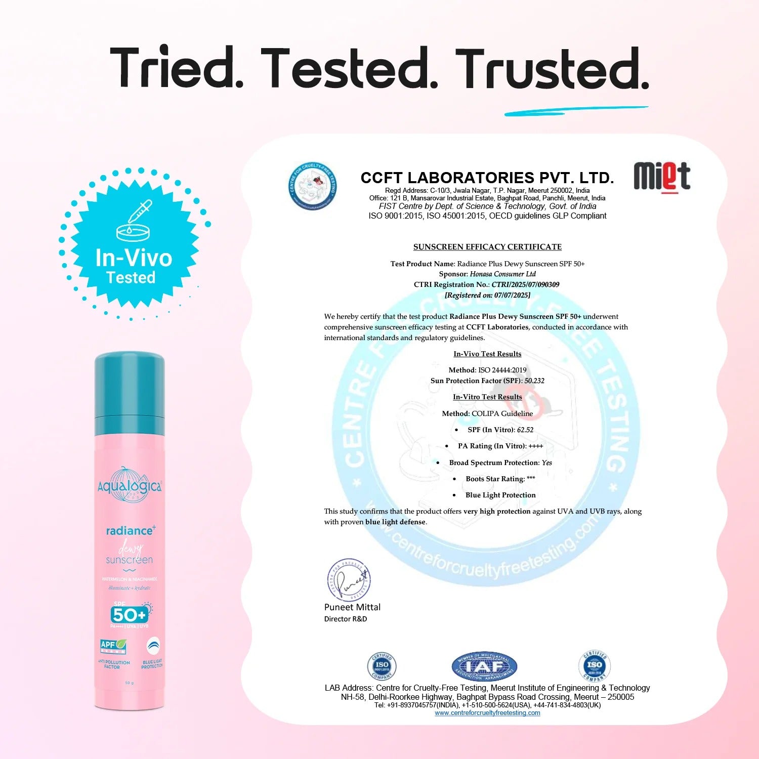 Yes, The Aqualogica Radiance+ Dewy Sunscreen SPF 50 PA++++ is in vivo tested, meaning it has undergone real-life skin testing to assess its effectiveness and safety and a proof of the product delivering SPF 50 as claimed. The product has broad-spectrum protection against UVA, UVB, and blue light.