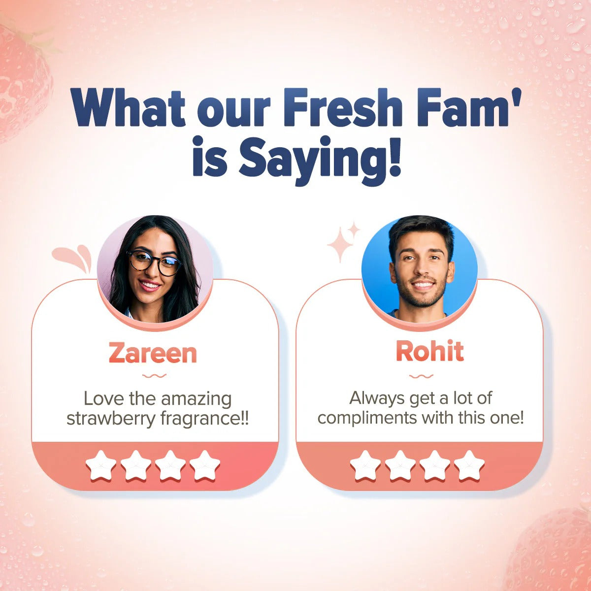 What if you could smell like sweet strawberries, and feel as sensual as a summer escapade. Sweet summer days and balmy evenings, here we come! Introducing Refresh+ Sweet Summer Kiss Perfume Body Mist, a blend of confidence & sensuality with a burst of strawberries, nectarine & musk. A warm hug of the golden hour, a cool summer breeze, a glass of crushed berries & you frolicking through the day – tempting summer vibes, right?