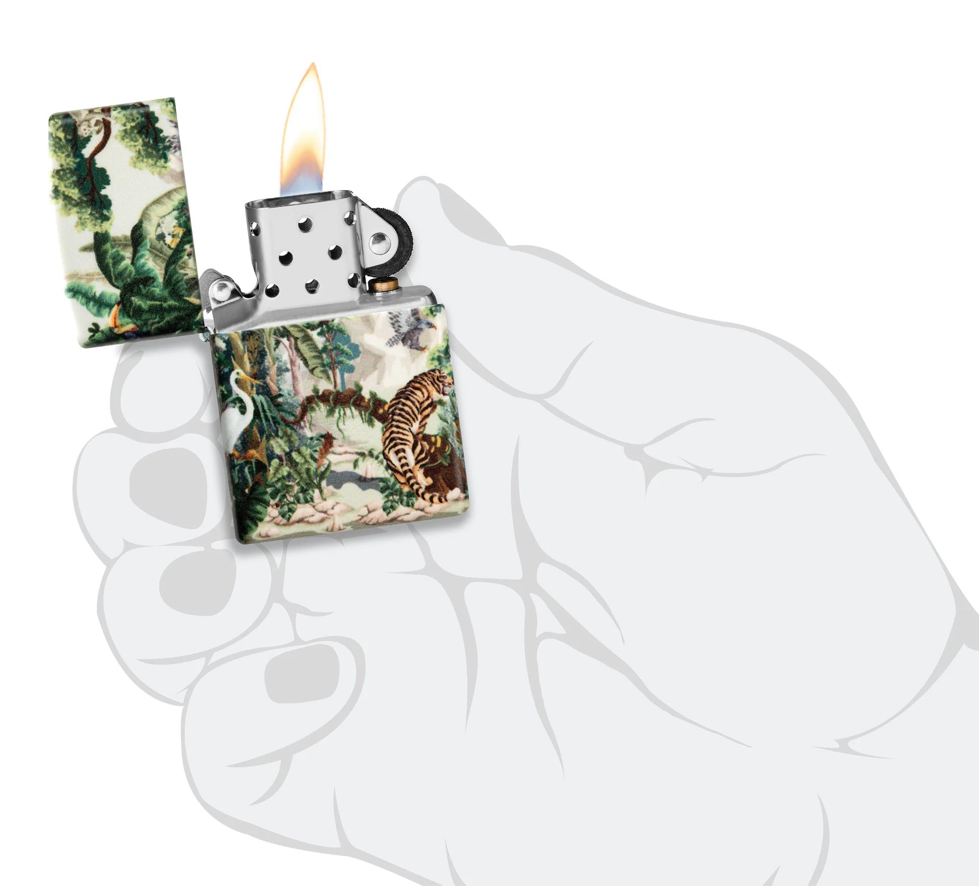 Let this lighter transport you straight into a tropical jungle! The flora and fauna of the rainforest are captured in vibrant detail on all sides of the 540 Color lighter for a truly immersive effect. Comes packaged in a gift box. For optimal performance fill with Zippo lighter fuel.