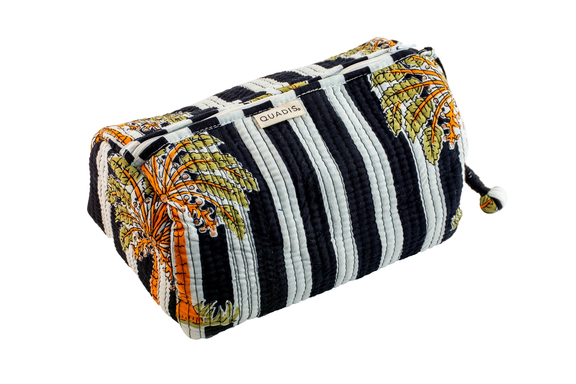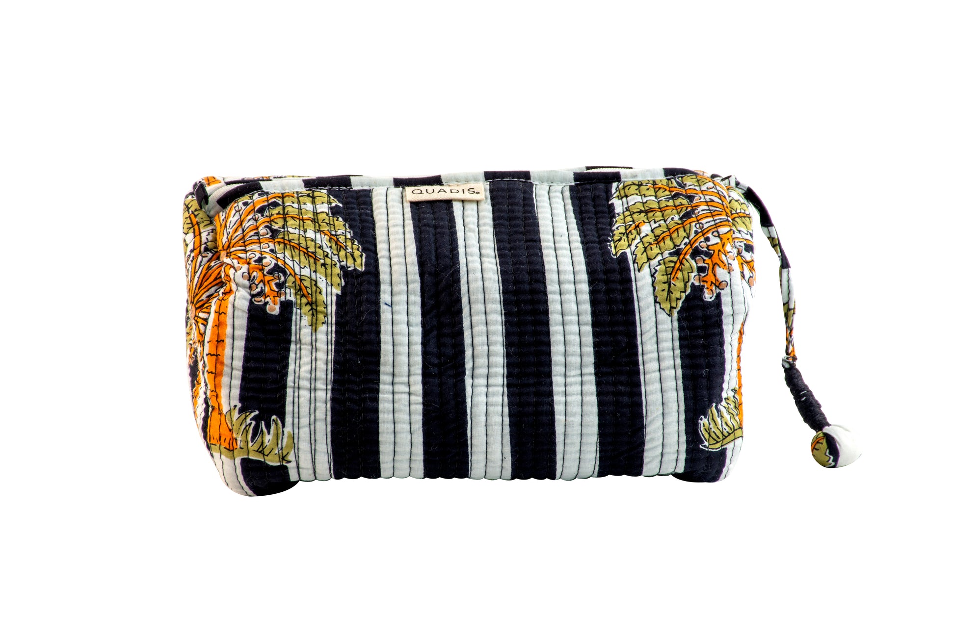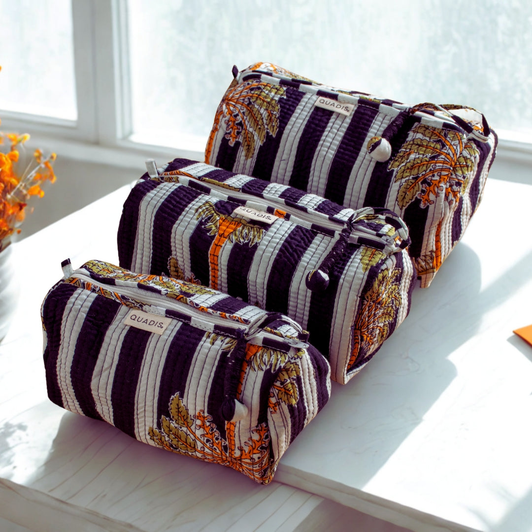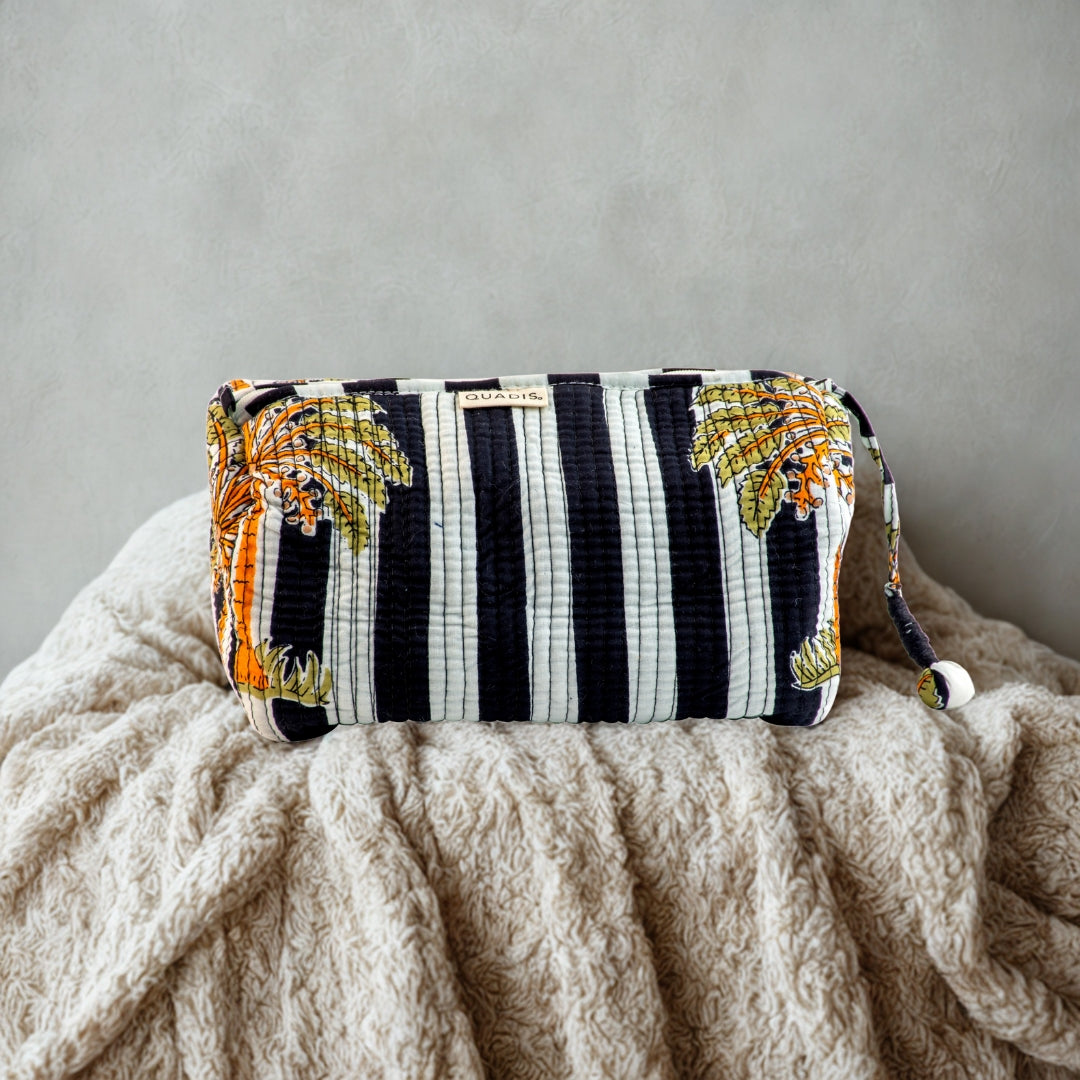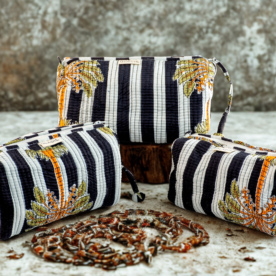 Bold, breezy, and effortlessly stylish—our Tropichic wash bag is a love letter to island escapes and sun-drenched afternoons. With striking black-and-white stripes as a backdrop, the golden palms stretch across the surface like silhouettes swaying against a tropical sky. Hand block printed by artisans in Jaipur, it’s where timeless technique meets a jet-set spirit.